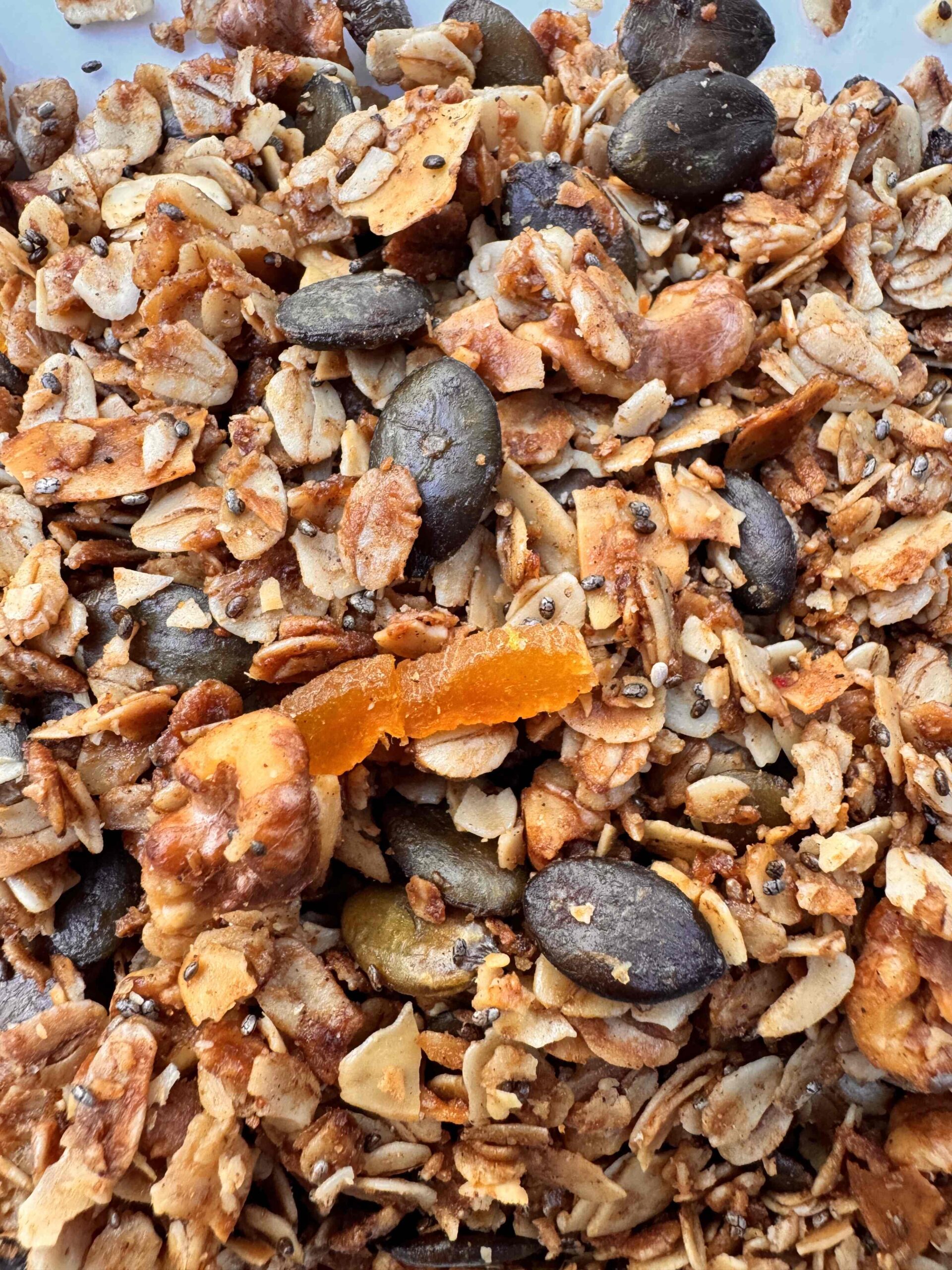 Oats, almond, coconut fat, walnuts, maple syrup, pumpkin seeds, chia seeds, cinnamon, salt, nutmeg, apricots & cranberries.