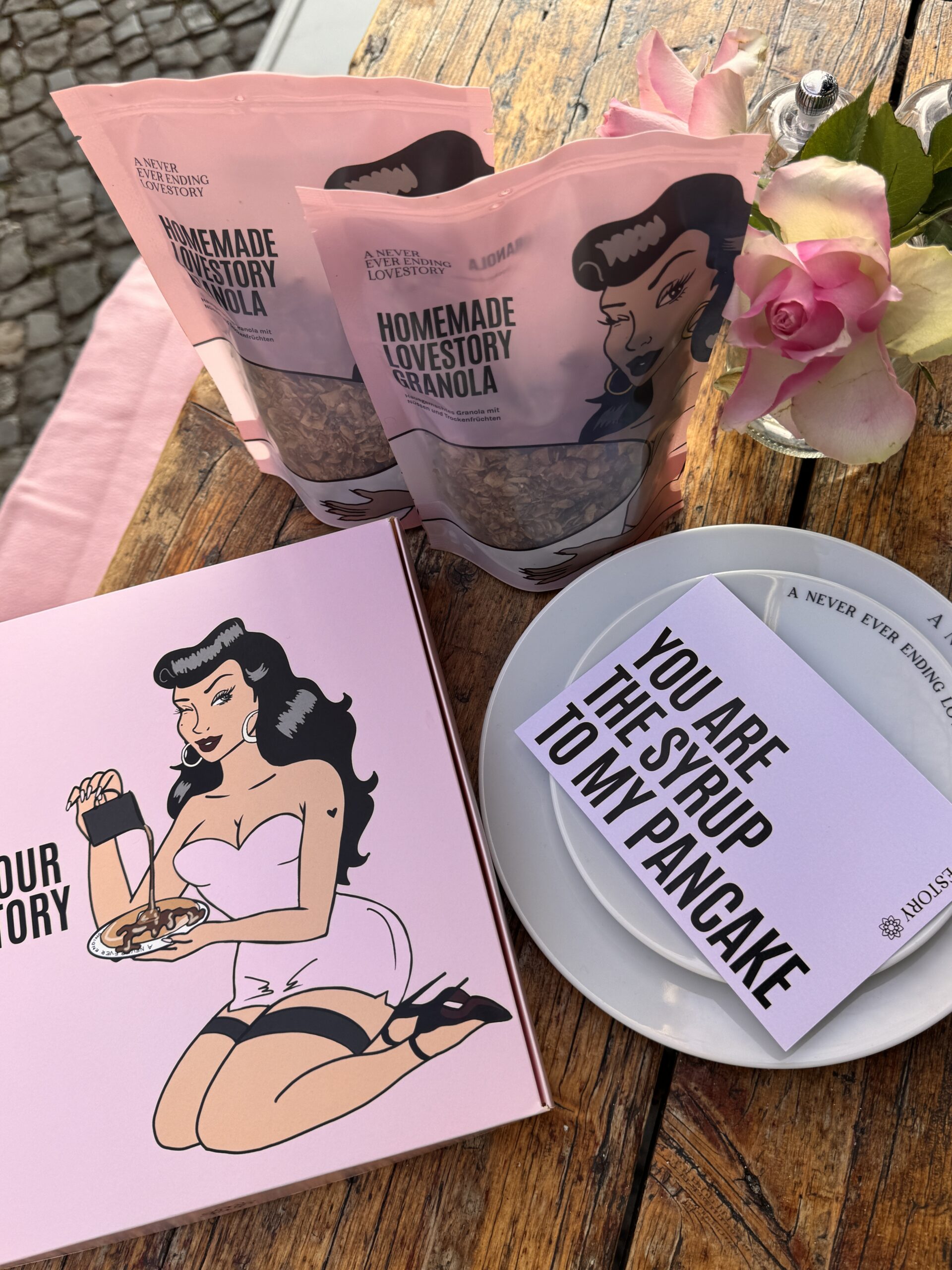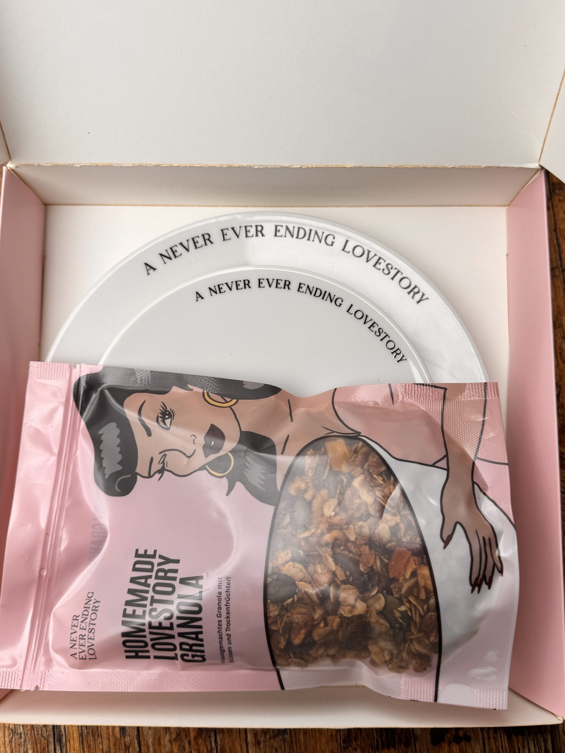 Marie’s Set brings together our bestselling homemade granola, the iconic Love Story plate, and a 30€ restaurant gift card. A beautiful mix of taste, style, and a little extra joy for someone special.